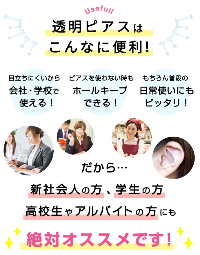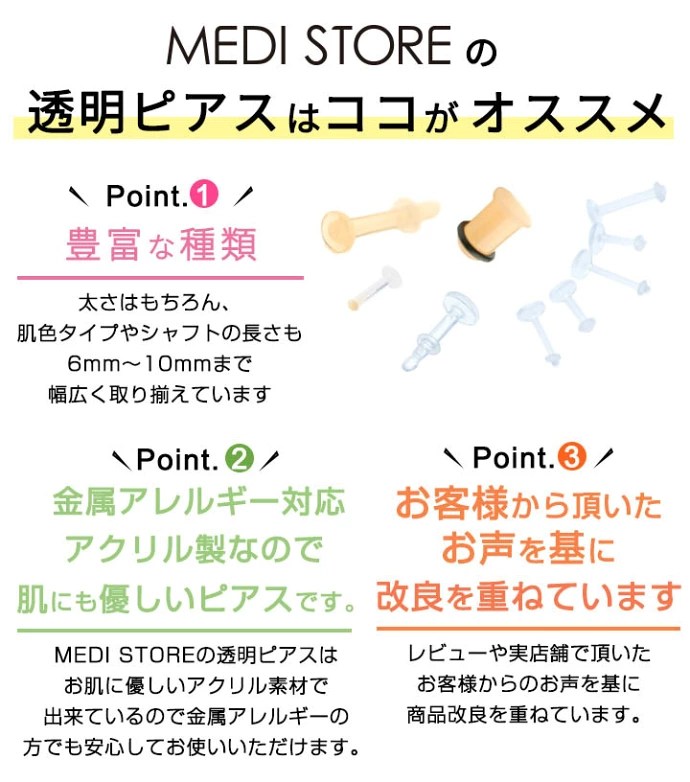 どうしてもピアスを外さないといけない場面でも大切なホールをキープ出来る!他店にはないメディストアだけの【0G】シークレットピアスです。日本人の肌の色に同化する肌色を選びました。学校や職場でのシークレットピアスに最適です。1個は持っていたいアイテムです。